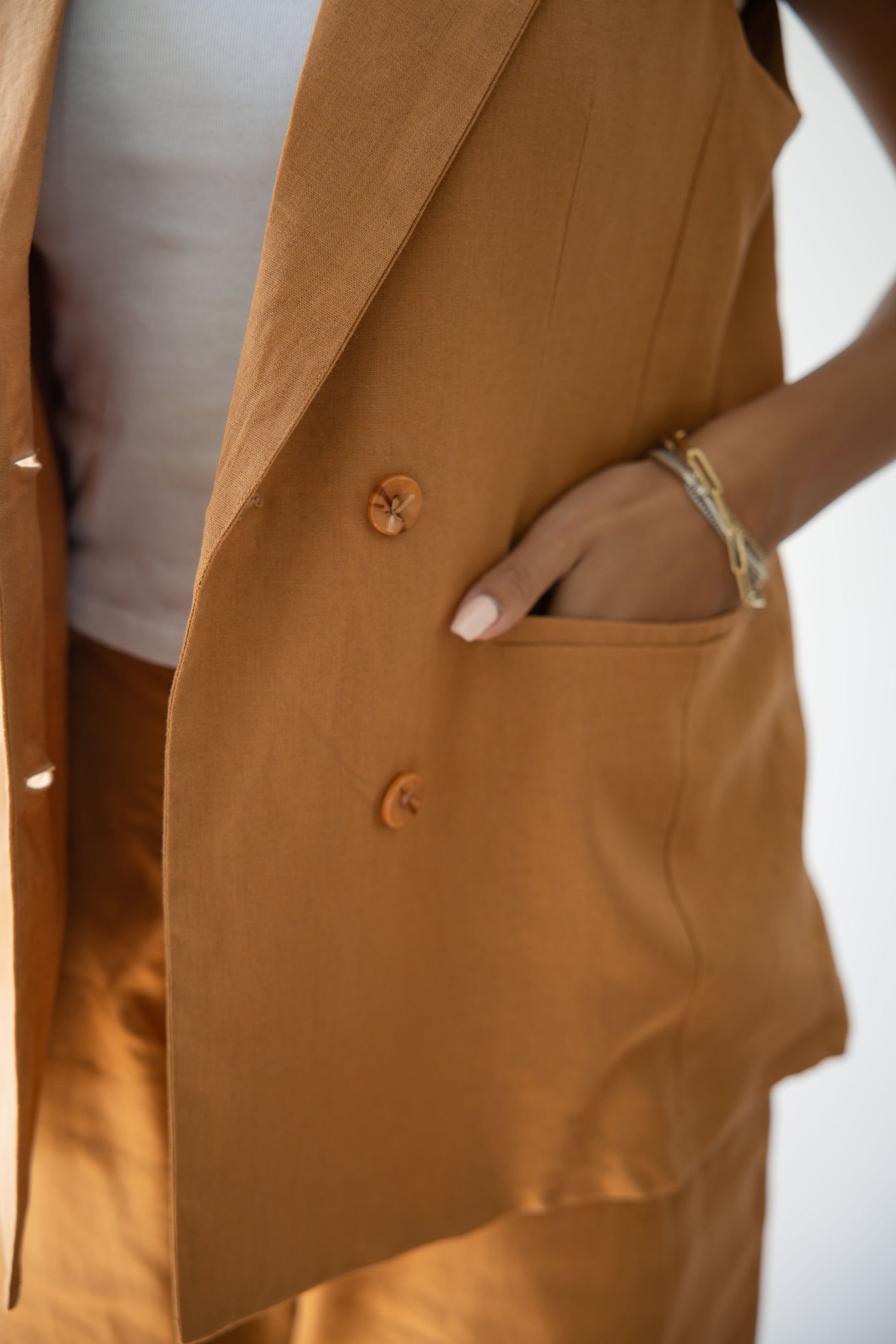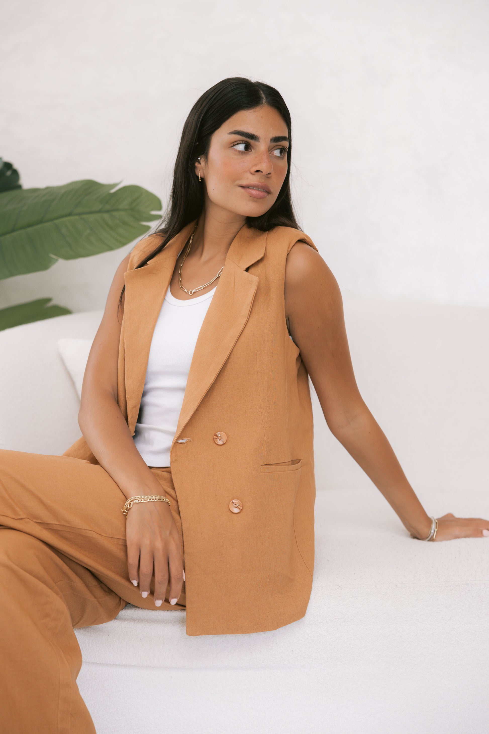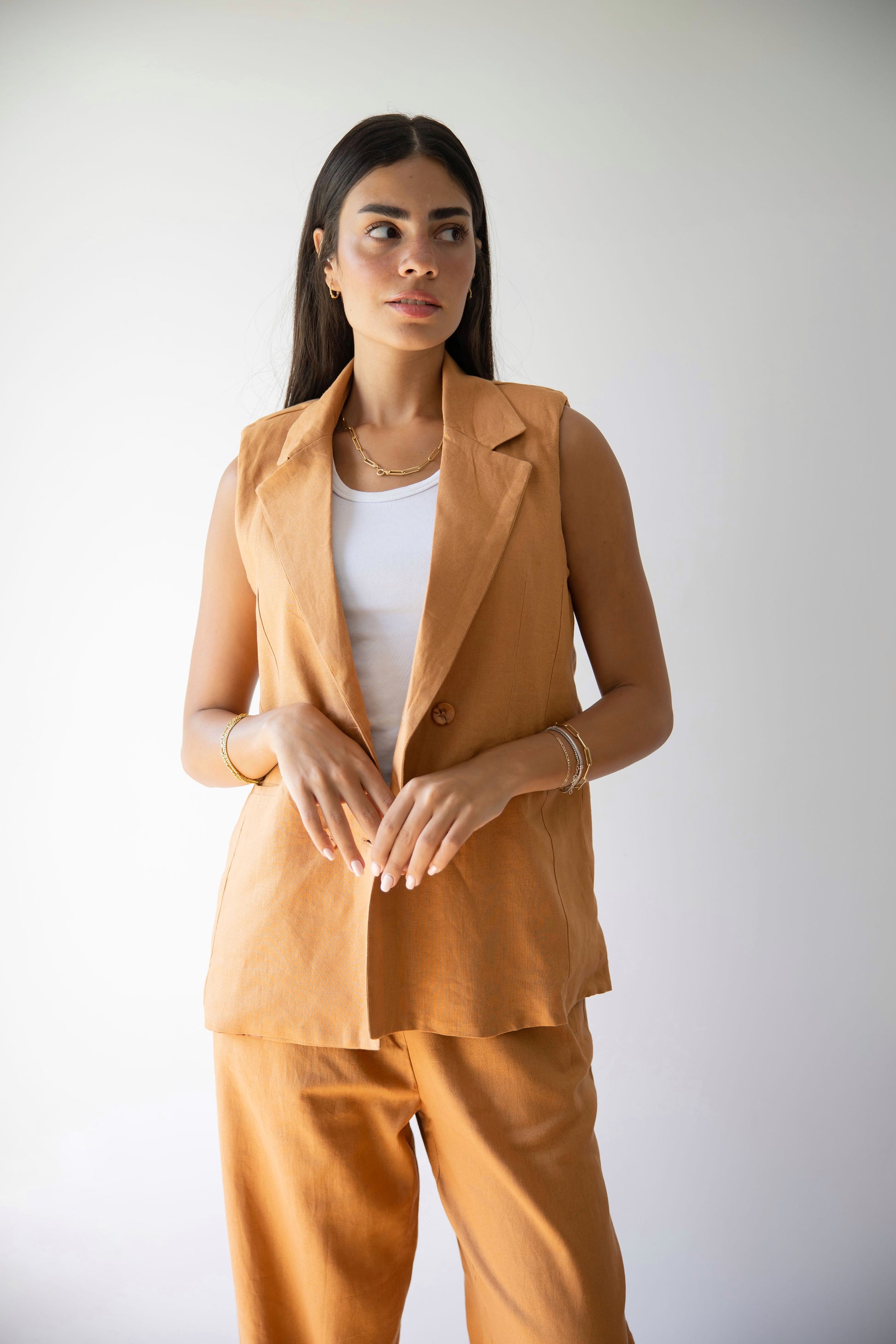 A structured staple with a laid-back edge — the Lino Vest is tailored from premium linen for a breathable, lightweight feel. Designed with clean lines, a deep V-neck, and front button closure, it flatters the form while keeping things effortless. Wear it buttoned up for a sharp, minimal look or layered open for easy summer styling. Pairs perfectly with the matching Lino Pants or styled your way.